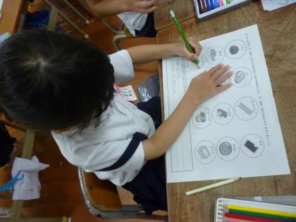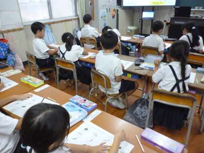1年生は、「好き嫌いしないで食べよう」というテーマで、栄養教諭と一緒に学習しました。食べ物ははたらきによって「黄・赤・緑」の3つの仲間に分けられることを知り、3つの仲間がそろうと栄養のバランスがよくなることを学びました。