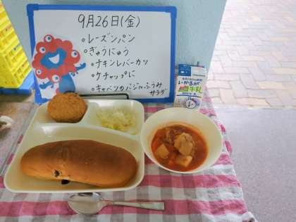 今日の給食は、レーズンパン、牛乳、チキンレバーカツ、ケチャップ煮、キャベツのバジル風味サラダです。