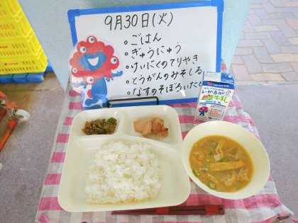 今日の給食は、ごはん、牛乳、鶏肉の照り焼き、冬瓜のみそ汁、なすのそぼろいためです。