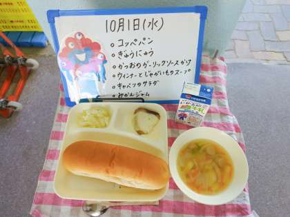 今日の給食は、コッペパン、牛乳、かつおのガーリックソースかけ、ウインナーとじゃがいものスープ、キャベツのサラダです。