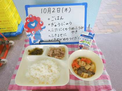 今日の給食は、ごはん、牛乳、豚肉の梅風味焼き、吹き寄せ煮、茎わかめのつくだ煮です。