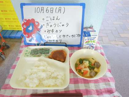 今日の給食は、ごはん、牛乳、みそカツ、じゃがいもと野菜の煮物、やきのりです。