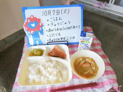 今日の給食は、ご飯、牛乳、赤魚のしょうゆだれかけ、豚汁、きゅうりのゆず風味です。