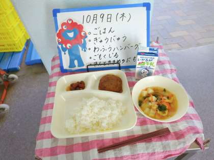 今日の給食は、ごはん、牛乳、和風ハンバーグ、五目汁、金時豆の煮ものです。
