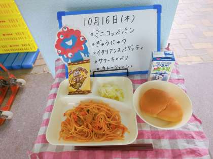 今日の給食は、ミニコッペパン、牛乳、イタリアンスパゲッティ、サワーキャベツ、カレーフィッシュです。