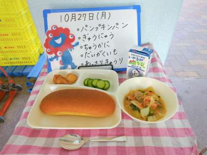 今日の給食は、パンプキンパン、牛乳、中華煮、大学芋、あっさりきゅうりです。
