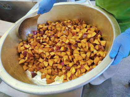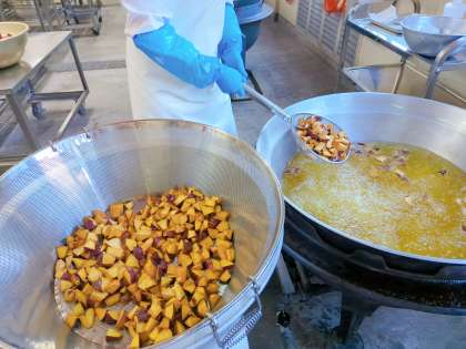 今日はさつまいもを油で揚げ、砂糖、塩、こいくちしょうゆで作ったみつをからめて手づ切りしました。
