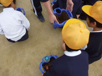 1年生はチューリップを植えています。