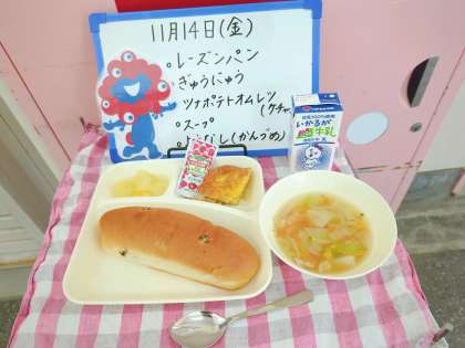 今日の給食は、レーズンパン、牛乳、ツナポテトオムレツ(ケチャップ)、スープ、洋なし(缶詰)です。