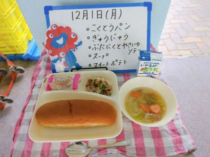 今日の給食は、黒糖パン、牛乳、豚肉と野菜のソテー、スープ、スイートポテトです。