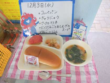 今日の給食は、コッペパン、牛乳、鮭のマリネ、肉団子と押し麦のスープ、りんご、いちごジャムです。