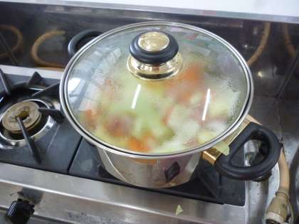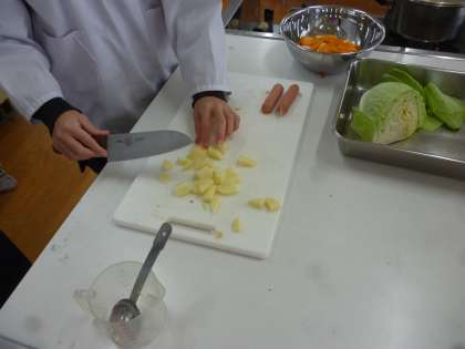 野菜たっぷりコンソメスープをグループで協力して作りました。
