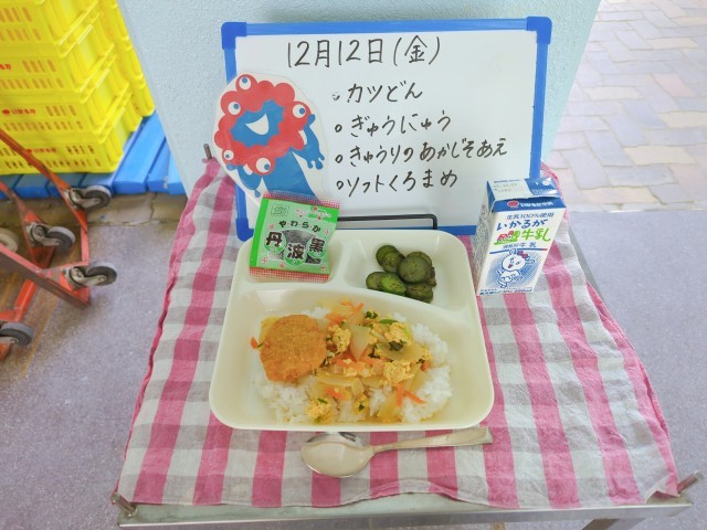 今日の給食は、カツ丼、牛乳、きゅうりのあかじそ和え、ソフト黒豆です。