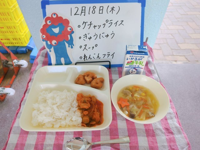 今日の給食は、ケチャップライス、牛乳、スープ、れんこんフライです。