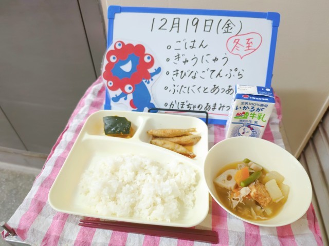 今日の給食では、冬至の行事食として「かぼちゃ」を焼いて甘みつをかけて仕上げました。教室では、「かぼちゃ苦手だったけど、食べたらおいしくておかわりする!(2年生)」「魚苦手だったけど、きびなごてんぷらおいしくて全部食べられた(1年生)」と児童に好評でした。