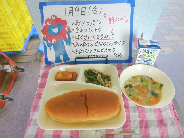 今日の給食は、おさつパン、牛乳、はくさいのとろみ煮、あつあげのピリ辛じょうゆかけ、豚肉とさんどまめのオイスターソースいためです。