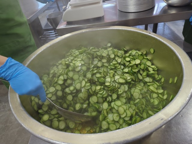 今日の給食は、ごはん、牛乳、さばのみそ煮、五目汁、きゅうりの甘酢づけです。