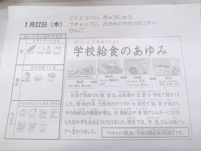 日本で初めての給食は、山形県の忠愛小学校で始まりました。昭和25年、大阪市のすべての小学校で給食が始まり、その後献立の種類が増え、行事献立や食物アレルギーに対応したおかずも出るようになりました。現在では、牛乳びんは紙パックへ変わりました。