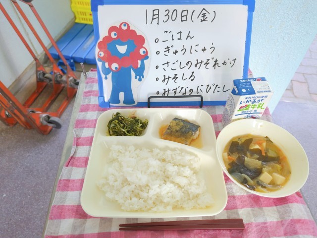 今日の給食は、ごはん、牛乳、さごしのみぞれかけ、みそ汁、水菜の煮びたしです。