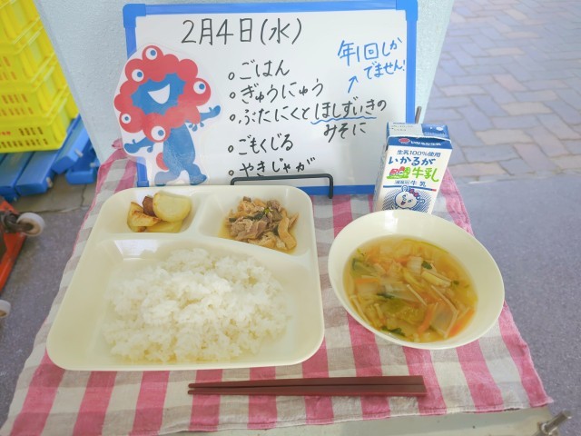 今日の給食は、ごはん、牛乳、豚肉と干しずいきのみそ煮、五目汁、焼きじゃがです。