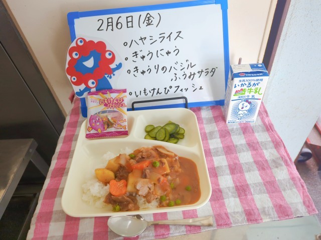 今日の給食は、ハヤシライス、牛乳、きゅうりのバジル風味サラダ、いもけんぴフィッシュです。