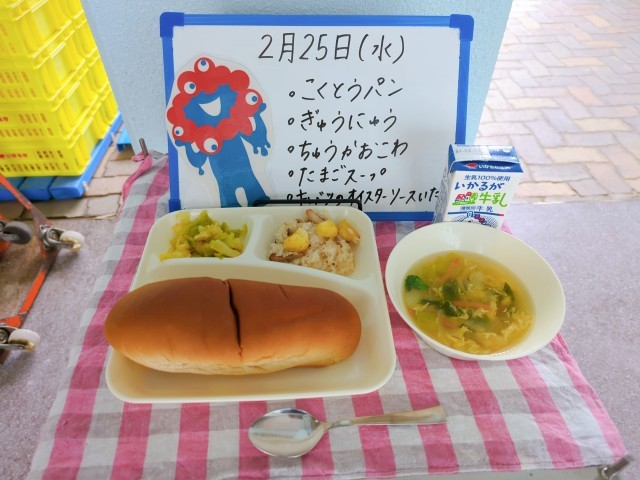 今日の給食は、黒糖パン、牛乳、中華おこわ、卵スープ、キャベツのオイスターソース炒めです。