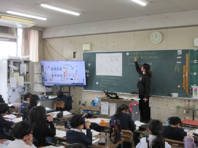 理科では、「同じ体積でも、ものの種類が違うと重さが違うのか」という問題に対して、予想をし、実際に調べていました。