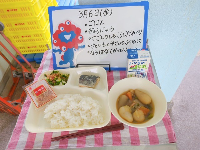 今日の給食は、ごはん、牛乳、さごしの塩麴だれかけ、里芋と野菜の含め煮、菜の花のお浸し(かつおぶし)です。