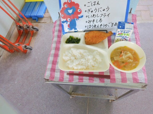 今日の給食は、ごはん、牛乳、いわしフライ、みそ汁、ほうれん草のごま和えです。