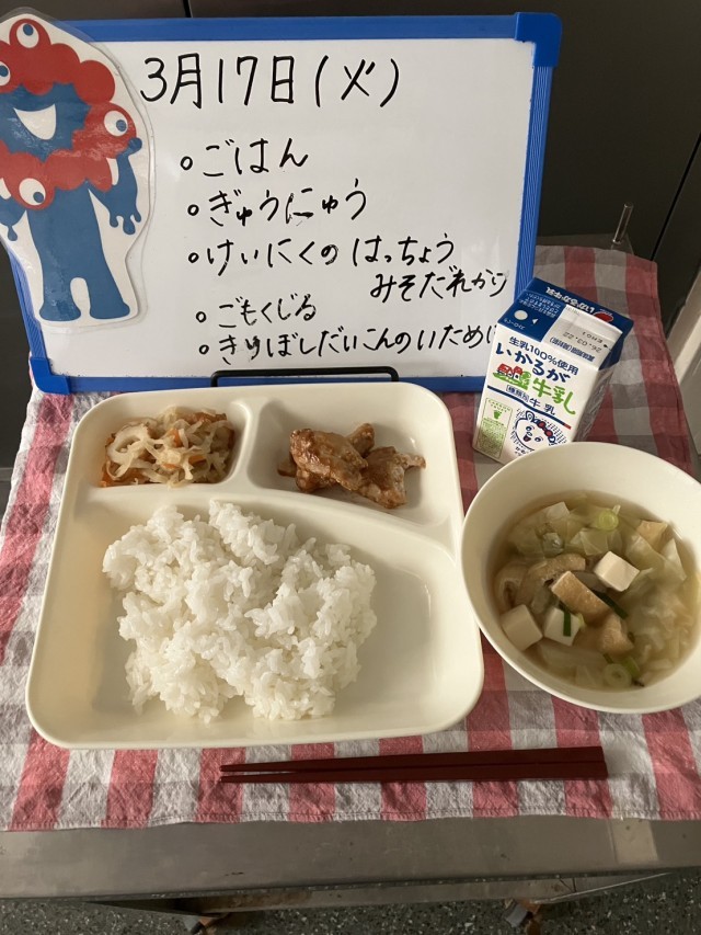 今日の給食は、ごはん、牛乳、鶏肉の八丁味噌だれかけ、五目汁、切干しだいこんのいため煮です。