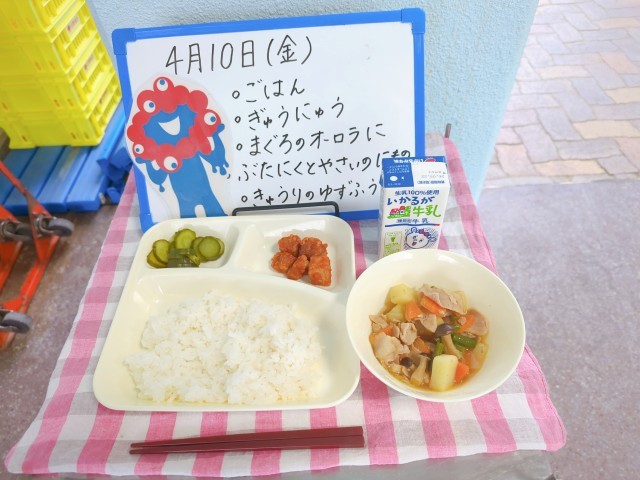今日の給食は、ごはん、牛乳、まぐろのオーロラ煮、豚肉と野菜の煮物、きゅうりのゆず風味です。