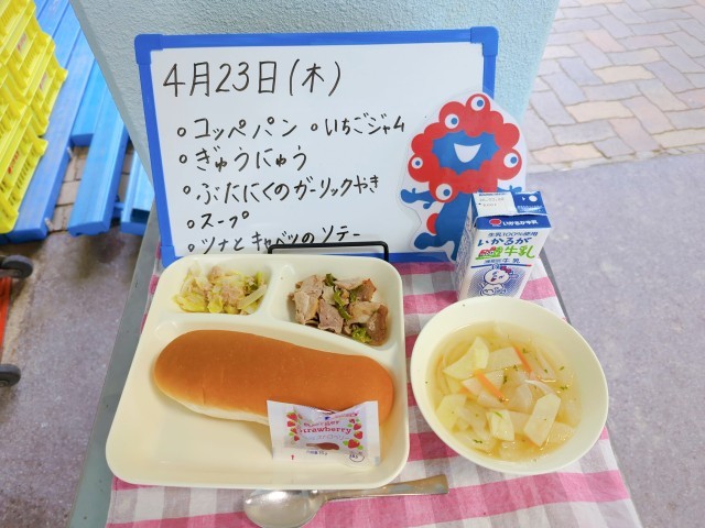 今日の給食は、コッペパン、牛乳、豚肉のガーリック焼き、スープ、ツナとキャベツのソテー、いちごジャムです。