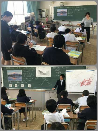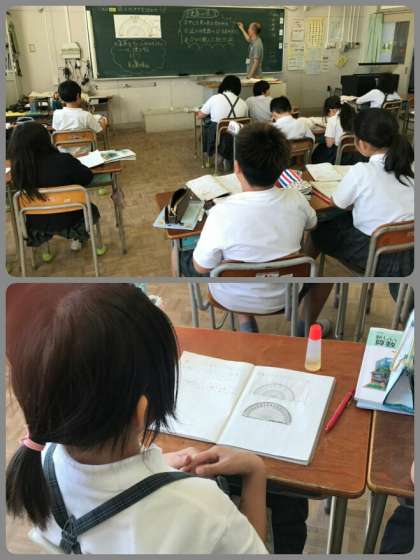 4年生は、分度器の使い方を学びました。5年生は、富士山の見え方を季節風に関係づけて考えました。6年生は、漢字の変化やカタカナの法則を協力して班で考えました。