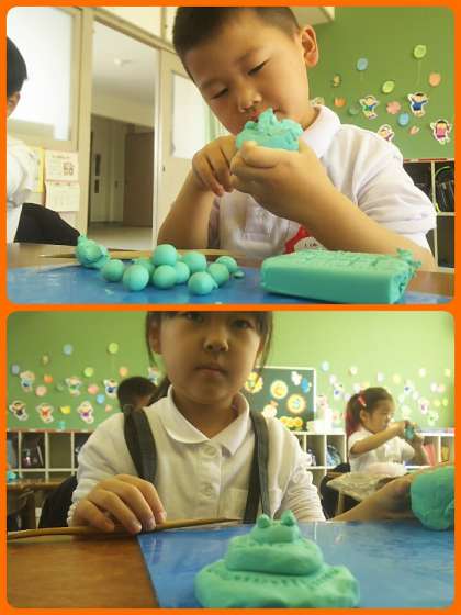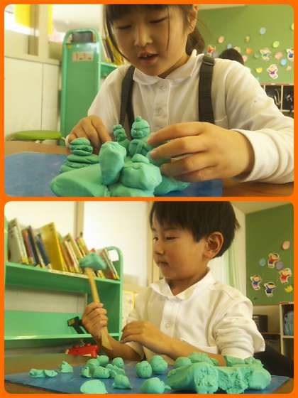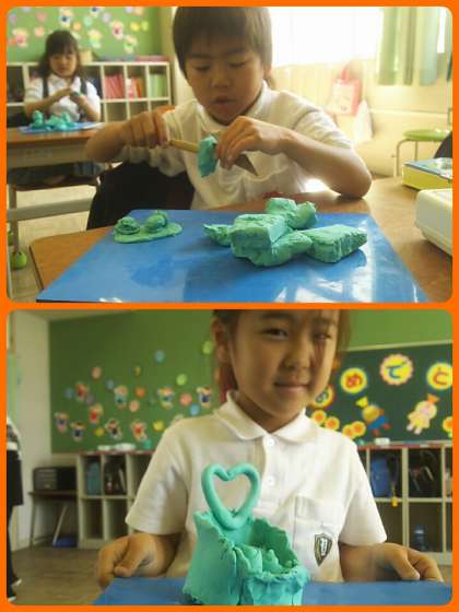 1年生は、粘土を使って自分の好きなものを作りました。こねて丸めたり、上手に切ったり、工夫して形にしていました。これからどんどん色んなものを作っていけるといいですね。