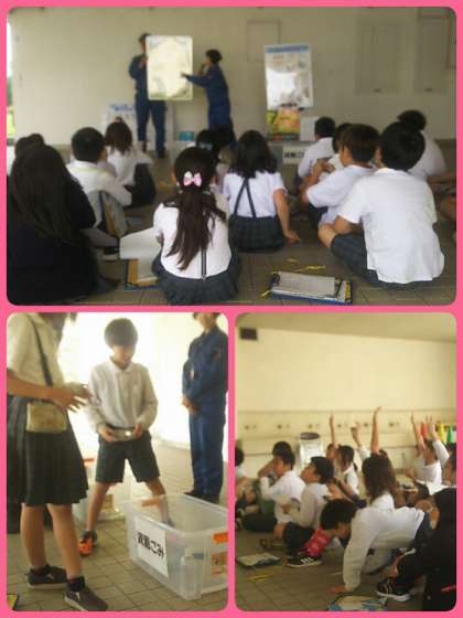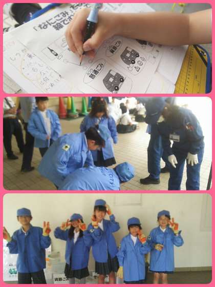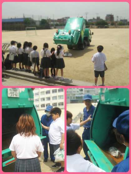 環境事業センターの方々に来ていただき、4年生はパッカー車体験授業を行いました。自分たちが用意したごみを実際にパッカー車の中に入れることができました。ごみの分別クイズでは一生懸命考え、答えていました。仕事で着る服や靴も身につけることもでき、有意義な時間となりました。