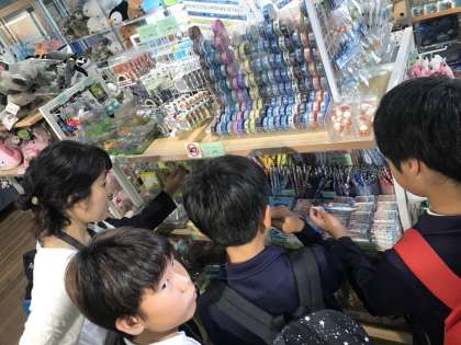 グループごとに、順調に見学しています。吸盤で体を支えて水槽の掃除をしておられる場面にも遭遇しました。お土産も選んでいます。