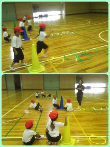 1年生は体育で、ハードル越え、コーン回り、ケンケンパなどをしながらリレーをしました。チームに声援も送りながら、最後まで全力でかけぬけました。少しずつ体力もついていくといいですね。