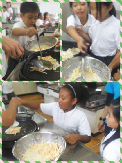 外国にルーツのある子の集まり、ハピネスワールドを行いました。2回目の今回は、遊びのあと、中国の「香煎土豆絲餅」という軽食をみんなで作りました。じゃがいもを使った料理で、上手に裏返して両面を焼きました。おかわりをしている子もおり、おいしくいただくことができました。
