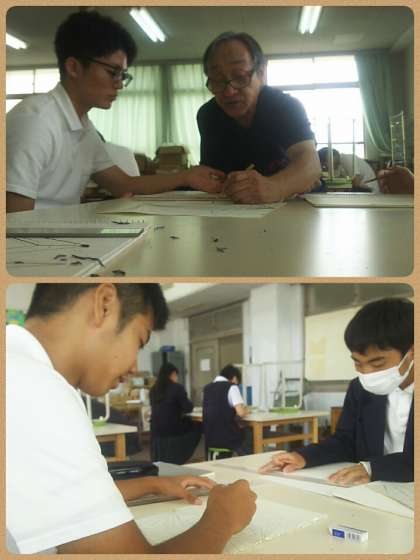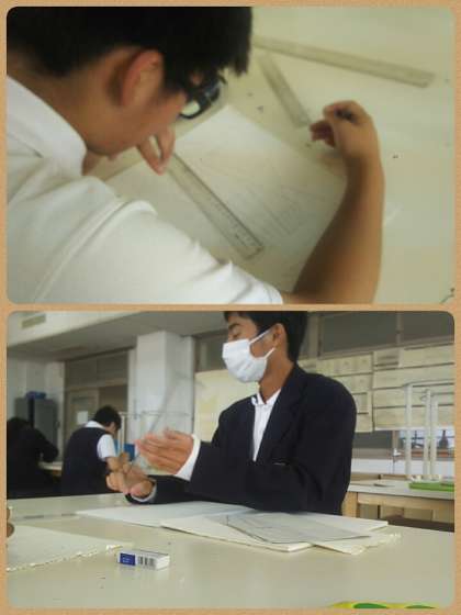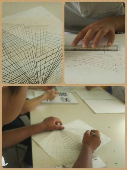 9年生は、美術の学習で一点透視図法を用いて、奥行きのある構成を描いていきました。試行錯誤を繰り返しながら、様々な構成を考え、個性的に表現されています。彩色して、完成に近付くのが楽しみです。