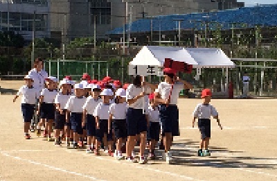 『体育祭入場行進』です。団旗係が工夫を凝らして作成した応援旗を先頭に、9年生から順番に入場してきます。小学校1年生から3年生は、6年生の代表がプラカードで誘導します。