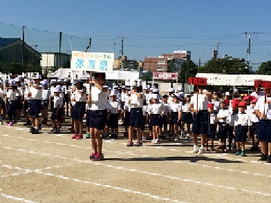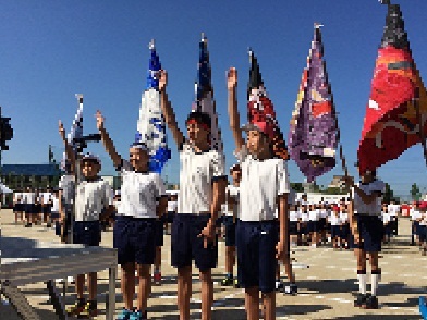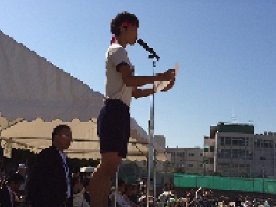 1年生から9年生までの全児童・生徒が入場しました。9学年の子どもたちが、『赤団』と『白団』に分かれて整列します。「開会宣言」「校長先生のあいさつ」「生徒会長のあいさつ」に続いて、『選手宣誓』です。小学生の代表と中学生の代表が気持ちを合わせて行いました。団旗に囲まれて、施設一体型小中一貫校ならではの『選手宣誓』です!!