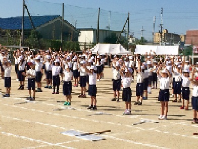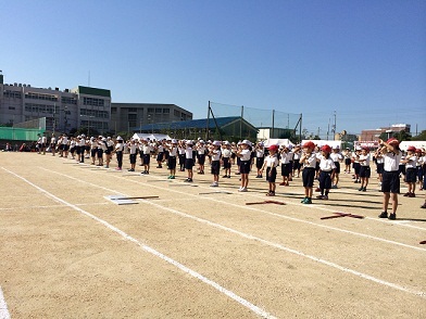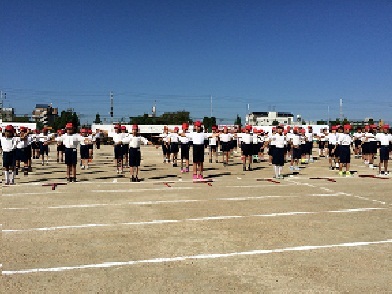 10月8日(水)は、とても天気に恵まれ、やたなか小中一貫校の子どもたちは、元気よく『体育祭』に取り組みました。プログラム3番『準備体操』です。1年1組を基準に体操の体形に開いた後、体をのびのびと動かしています。