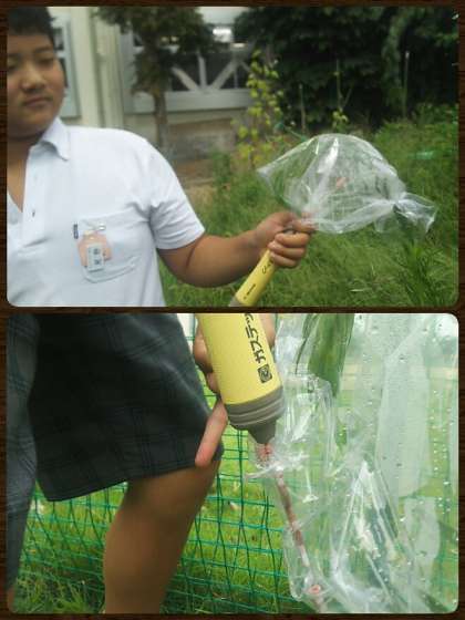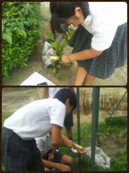 6年生は、理科で植物の呼吸について学んでいます。この日は、植物にふくろをかぶせて、気体検知管を使って二酸化炭素の量にどのような変化があるかを調べました。