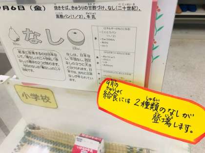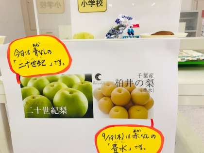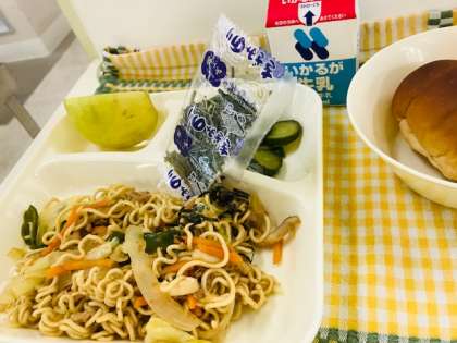 今日の給食は「焼きそば、きゅうりの甘酢づけ、なし(二十世紀)、