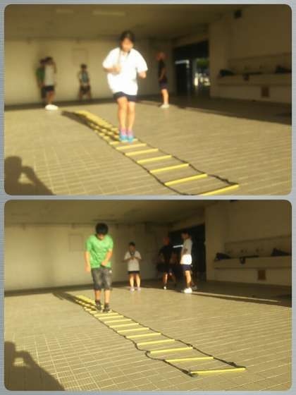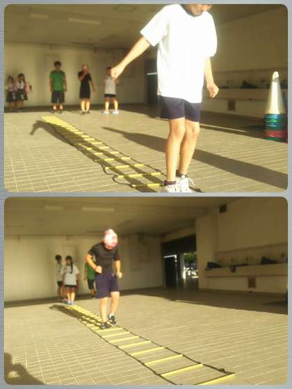 陸上部は、複雑なステップを高速で繰り返すラダートレーニングを行っています。俊敏性や動きの正確性が求められます。陸上部は、小学5年生も複数入部してがんばっています。これからも、自分の目標を意識してがんばっていきましょう。