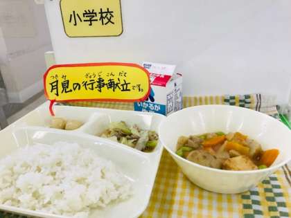 9/10(火)の献立は「鶏肉とさといもの煮もの、豚肉とキャベツのいためもの、みたらしだんご、ごはん、牛乳」でした。保健給食委員会の当番の放送後には、「お月見の献立や。」といった声が聞かれ、季節感を感じました。さといもやだんごを満月に見立て、食べ物の収穫に感謝する行事です。