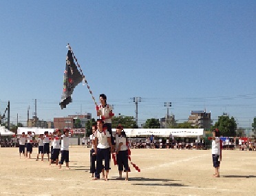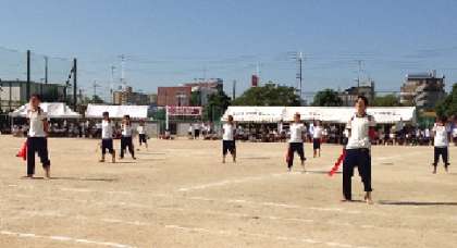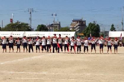 プログラム9番の応援合戦です。応援団は、5年生から9年生で構成されています。9年生が中心となって、応援の内容をすべて子どもたちで作っています。限られた練習時間の中で、9年生がリーダーシップを発揮し、本番に向けて取り組んできました。