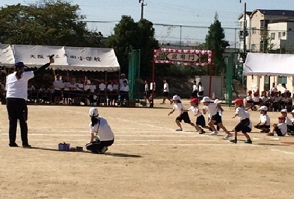 プログラム20番、1・2年生による『風を切って走れ!』です。一生懸命走っている1・2年生の姿に、思わずほほえんでしまいます。まずは、1年生が競技しました。平日のも関わらず、たくさんの保護者の皆様が応援してくださり、子どもたちの一層頑張っていました!!