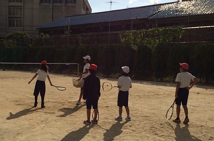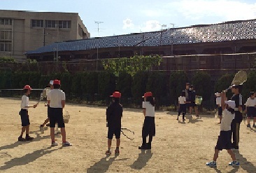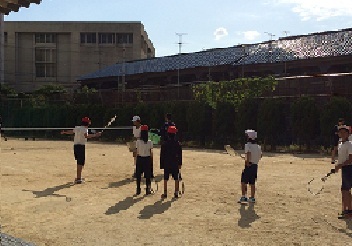 『ソフトテニス部』の活動の様子です。ラケットの扱い方を習ってから、中学生がボールを出して打たせてくれました。初めての子もいると思うのですが、上手にしていました。