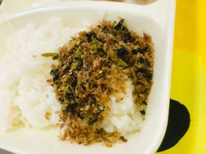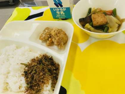 10/28の献立は「鶏肉のたつたあげ、あつあげと野菜の煮もの、おかかなっ葉、ごはん、牛乳」でした。「おかかなっ葉」は乾燥のだいこん葉、かつおぶし、いりごまを材料にした手作りのふりかけです。ごはんによく合う一品でした。これからの季節葉つきのだいこんが手に入れば、生のだいこん葉を使ってもおいしくできます。給食には「べにざけそぼろ」や「牛ひじきそぼろ」「ツナ大豆そぼろ」「のりのつくだ煮」などいろいろな「手作りごはんのおとも」が登場しています。